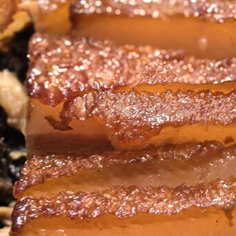 取五花肉,煮一个小时,清水,仅放姜,煮至筷子可插入,取出放凉,肉皮刷蜂蜜水,晾干,下油锅炸脆肉皮。